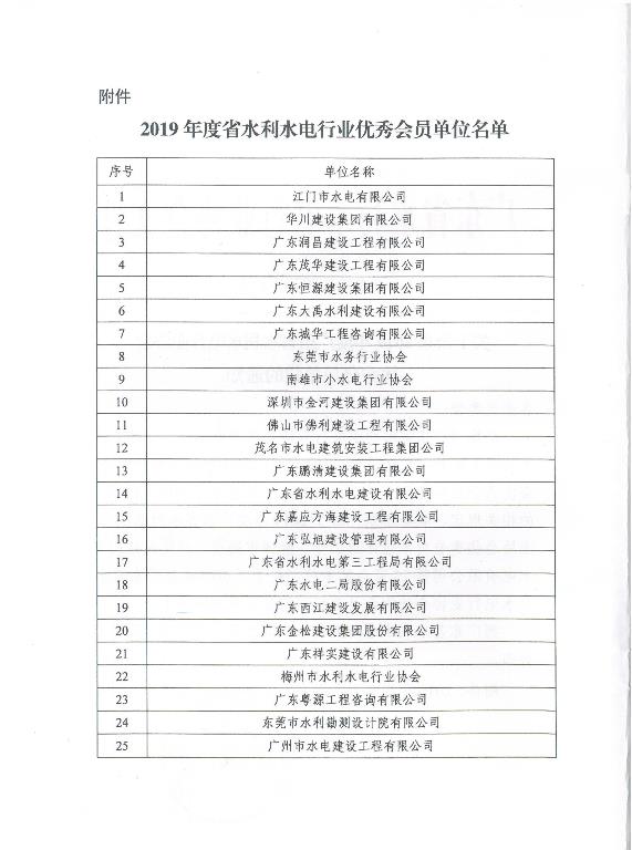 根據《廣東省水利水電行業協會優秀會員單位評選辦法(試行)》和《關于開展2019年度廣東省水利水電行業協會優秀會員單位評選活動的通知》(粵水協[2019]12號)的相關規定,我會組織開展了2019年度廣東省水利水電行業協會優秀會員單位評選工作。經評審通過,決定對廣東金松建設集團股份有限公司等25家會員單位,授予“2019年度廣東省水利水電行業協會優秀會員單位”稱號(詳見附件)。